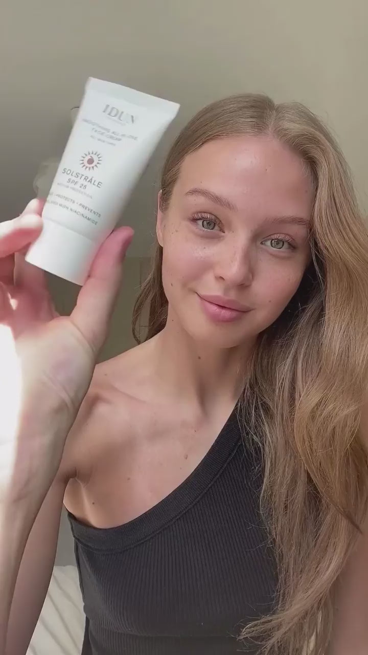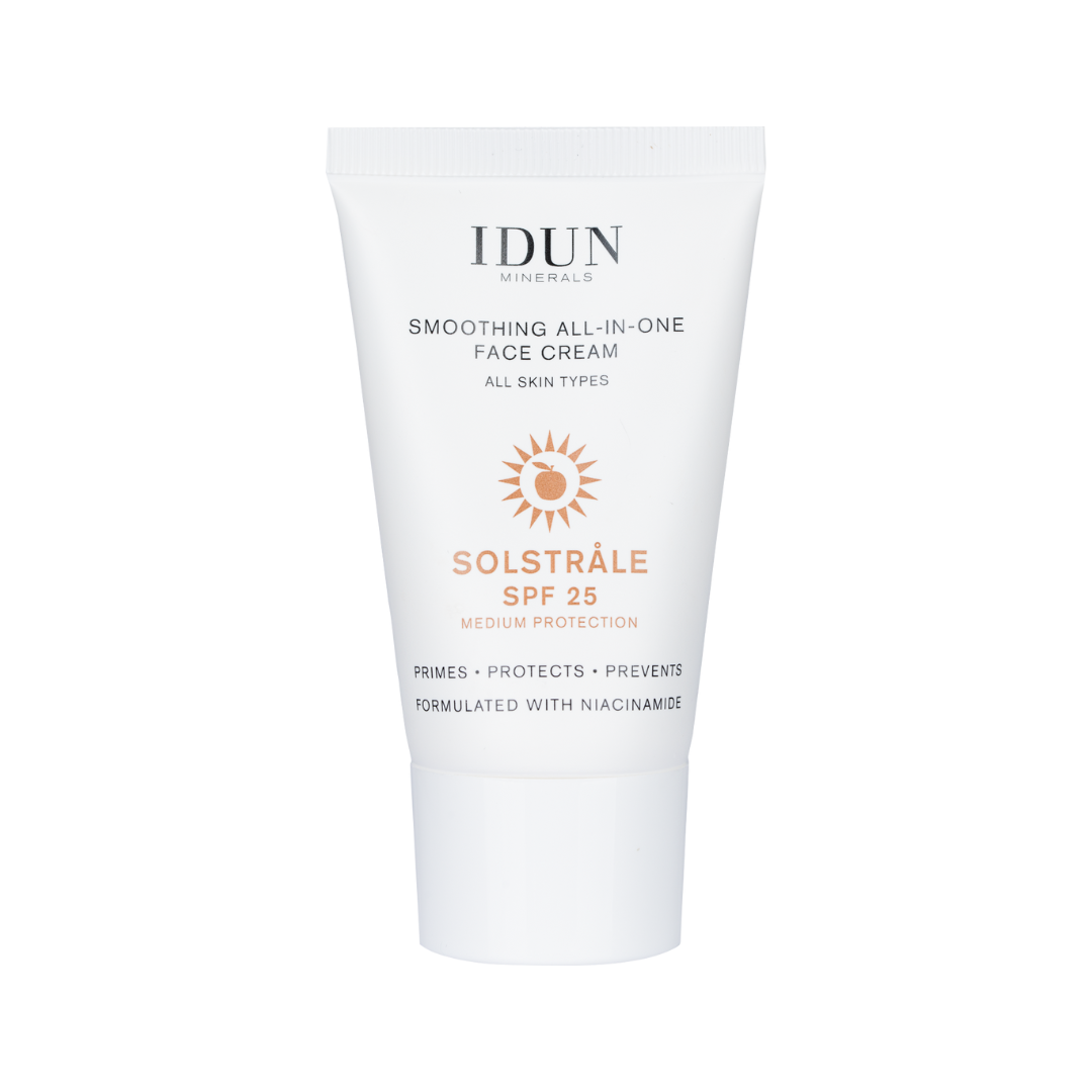 Primes, Protects, Prevents. IDUN Minerals Solstråle SPF 25 is a smoothing all-in-one vegan face cream developed to moisturize, prime and protect skin from harmful UV rays that can cause premature aging. Formulated with 3% niacinamide (vitamin B3), for added strengthening of the skin barrier and reduced pigmentation, the ultra-light, silky-smooth formula is rapidly absorbed into the skin leaving a subtly radiant complexion. The sunscreen ensures a SPF 25 against both UVA and UVB rays. The vitamins E and B3 prevent skin damage caused by free radicals thanks to their antioxidant action.